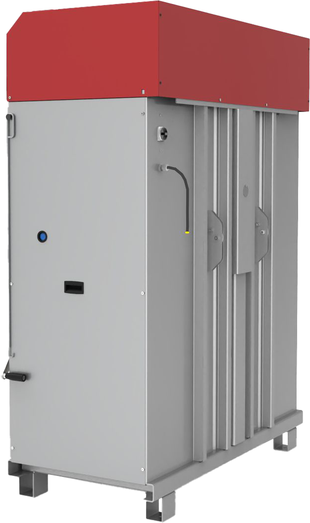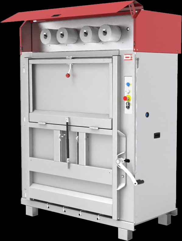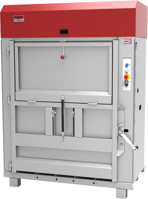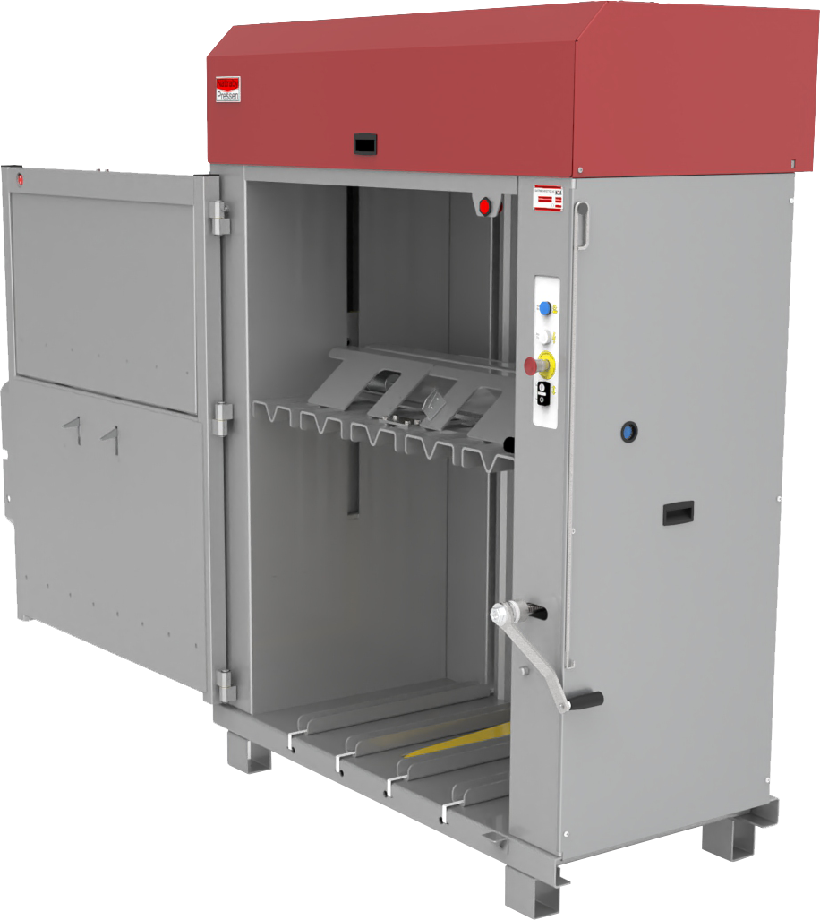 Pappressen har en totalhøjde på under 2 meter og er udstyret med en stor indkastningslåge. Det giver mange fleksible placeringsmuligheder og gør det nemt at fylde pressen.